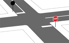 Innerhalb geschlossener Ortschaften kann das Haltgebot so angekündigt sein. Der Verlauf der Vorfahrtstraße kann durch ein Zusatzschild zu den Zeichen 205 und 206